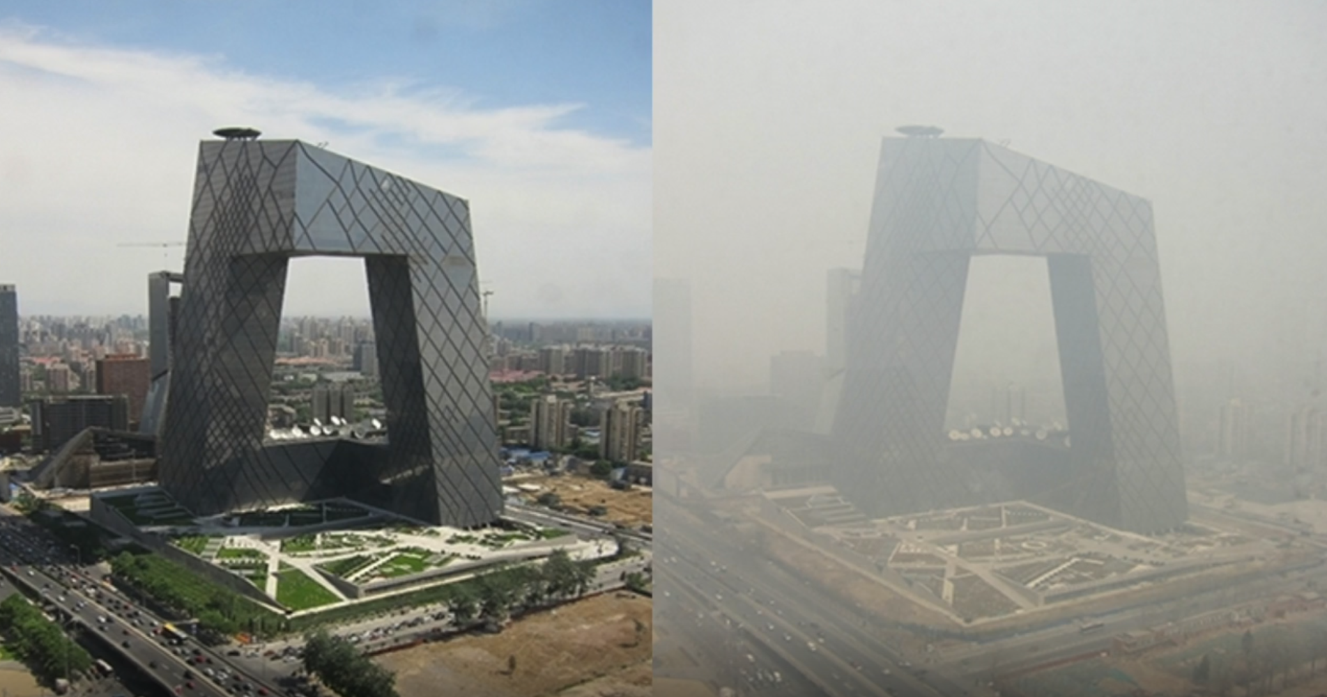 La foto a sinistra è stata scattata un bel sabato. Si possono vedere le auto, le persone, gli uccelli; la vita in un denso centro urbano. Mentre nell’immagine a destra, santo cielo, c’è solo l’inquinamento, completamente stratificato. Non si riesce a distinguere nitidamente quasi nulla. Questa immagine mi rese molto triste. Poco aveva a che fare con il futuro brillante che avevo immaginato, questo era l’orrore. Viviamo cinque o sei anni in meno, i bambini sono colpiti da cancro ai polmoni già a 6 anni. E così, in quel momento, sono stato ispirato dallo smog di Pechino. I governi di tutto il mondo combattono la loro guerra contro lo smog ma io volevo dare il mio contributo.